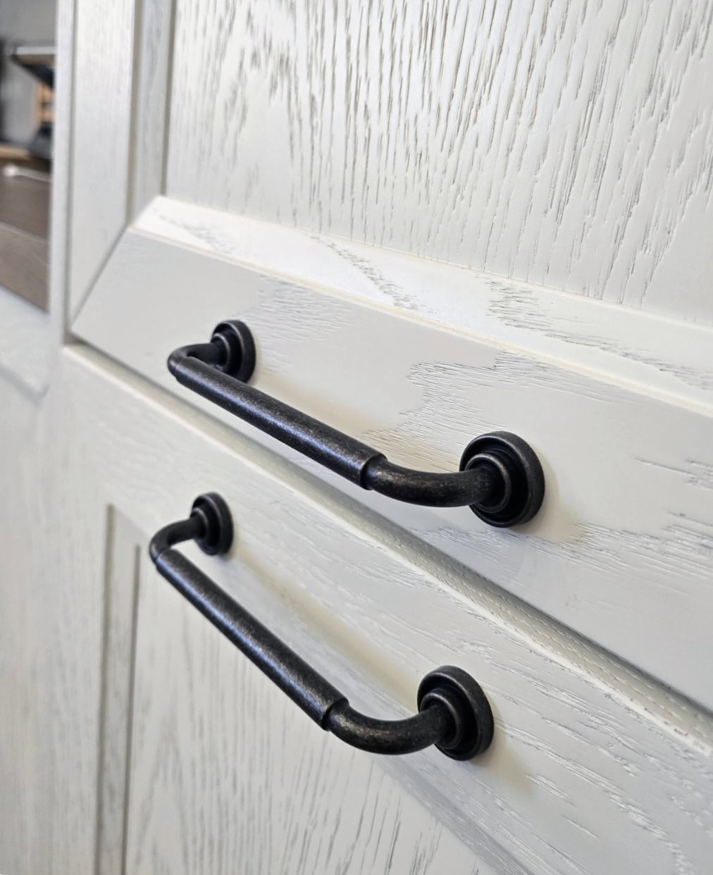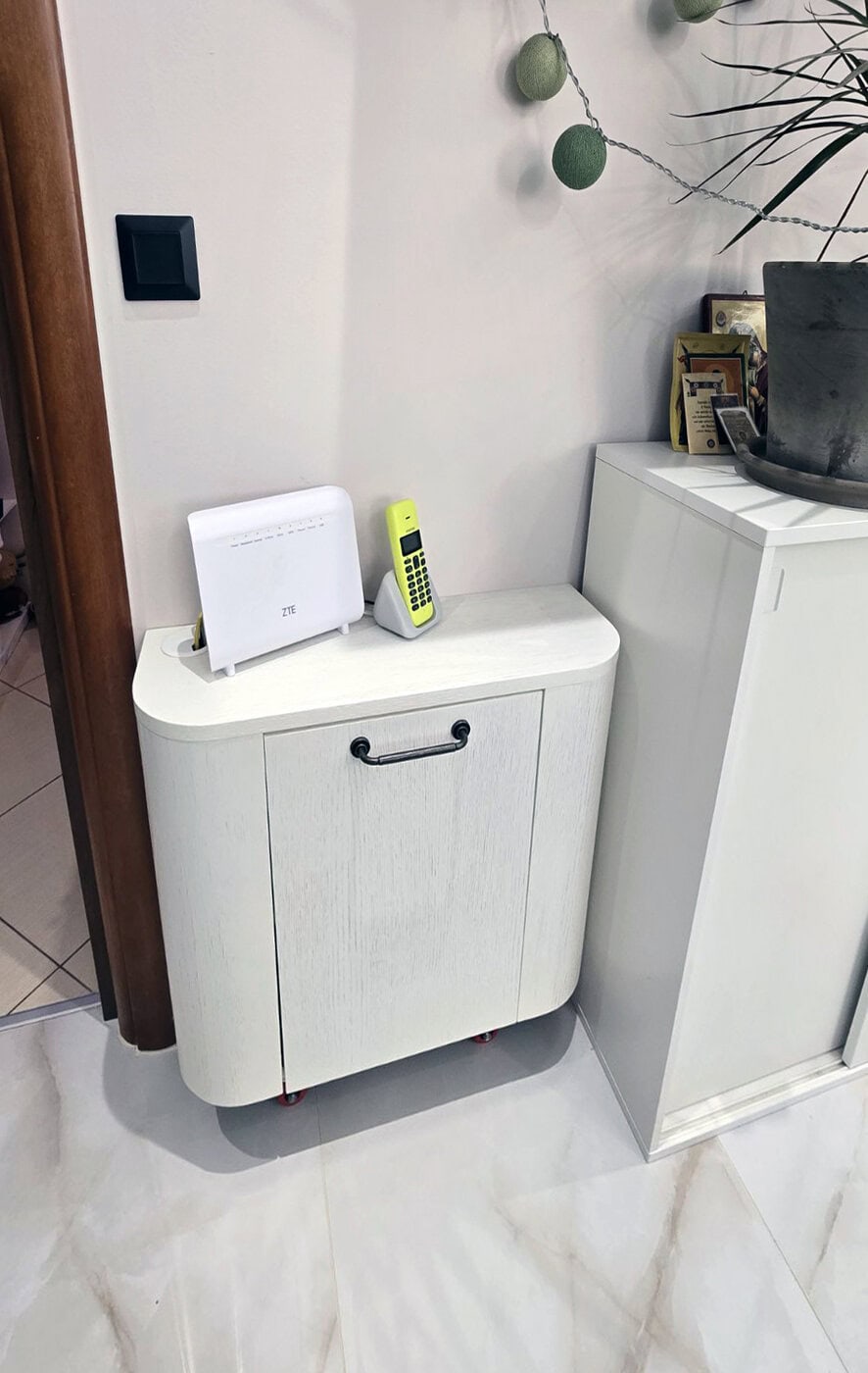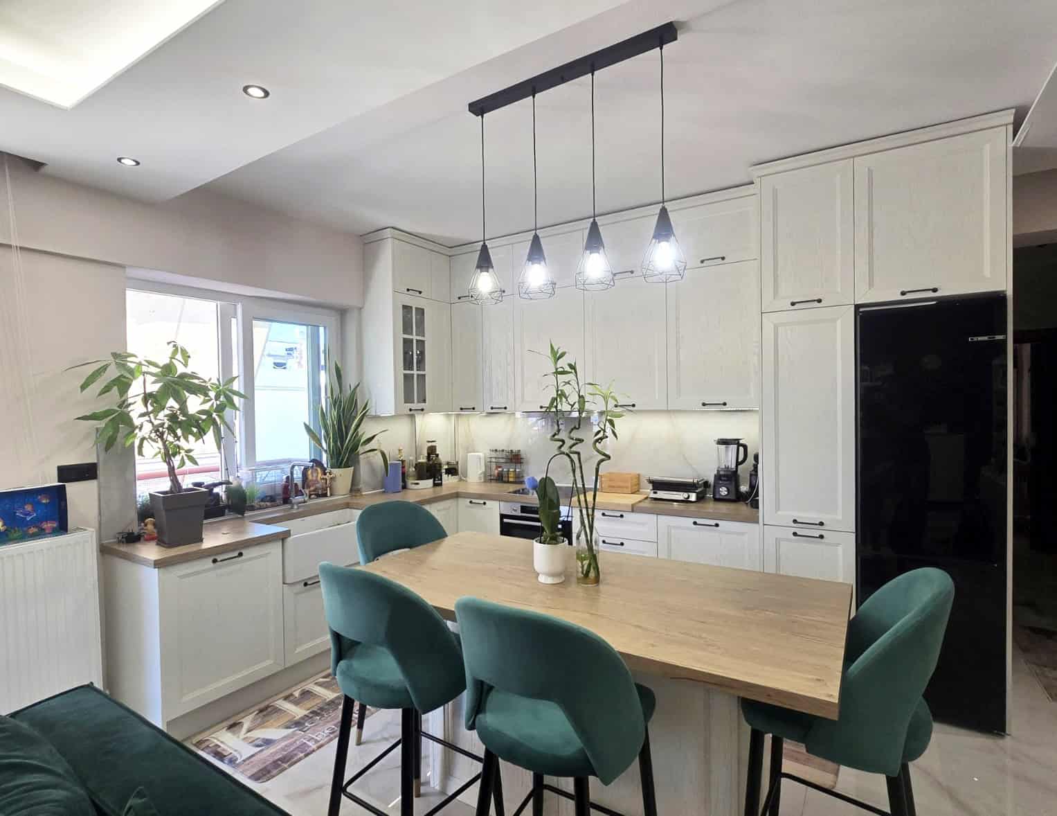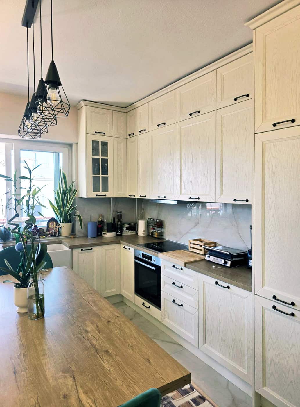 Κατασκευή επίπλων κουζίνας-νησίδας με πάγκο hpl compact με επεξεργασία για αντοχή σε χτυπήματα και υγρασία και ταμπλαδωτό πορτάκι ημιμασίφ δρυς λακαριστό, στη Σταυρούπολη Θεσσαλονίκης