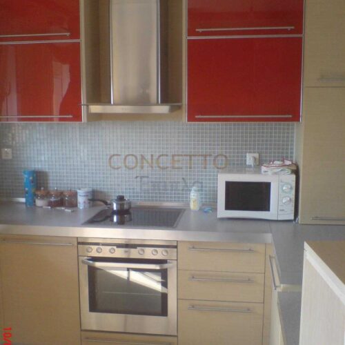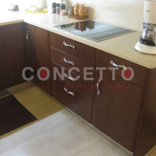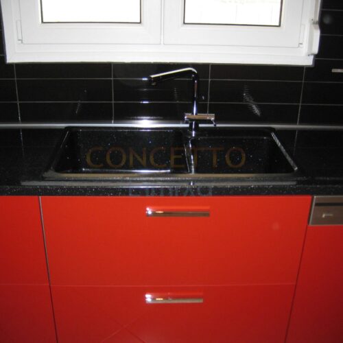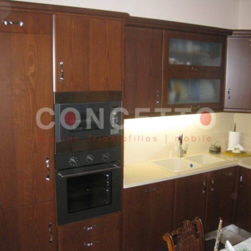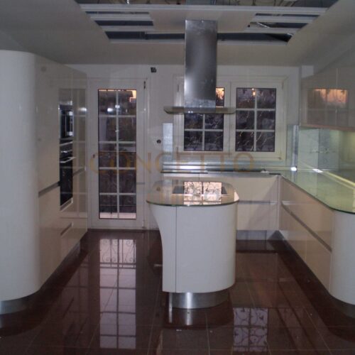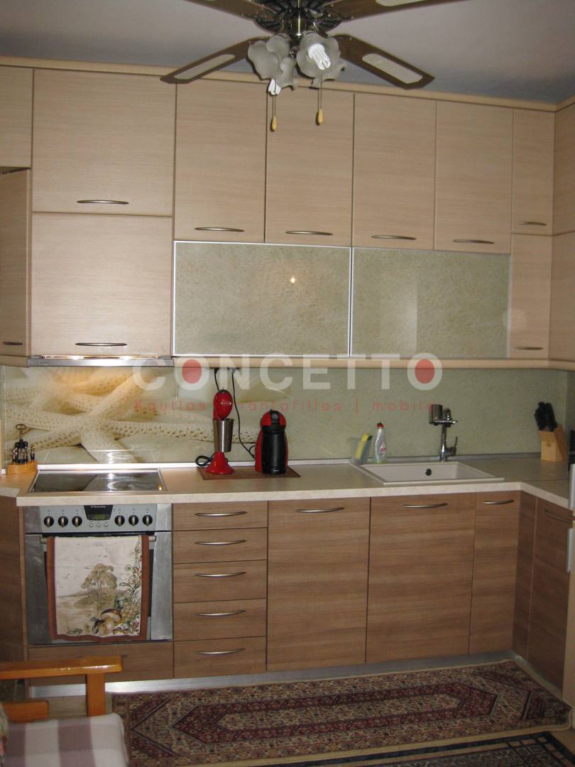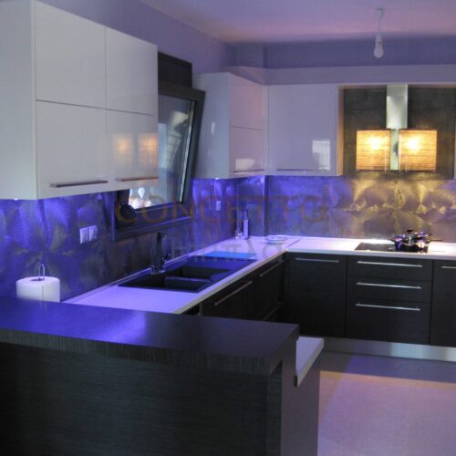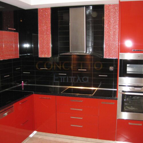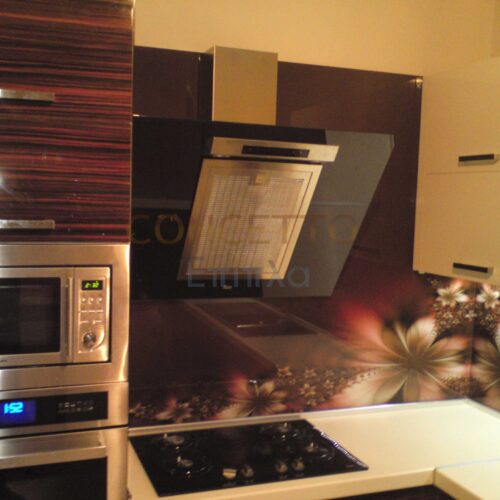 Κουζίνα κατασκευασμένη από MFC υψηλής ποιότητας και αισθητικής, με γυάλινη πλάτη ψηφιακής εκτύπωσης