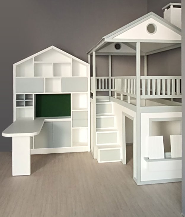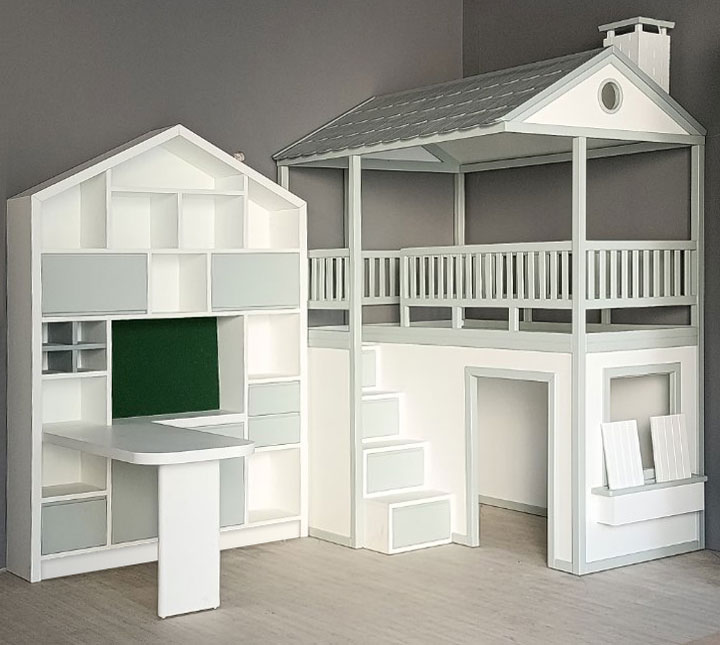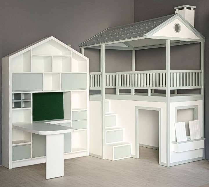 Κατασκευή κρεβατιού με βιβλιοθήκη και γραφείο σε σχήμα σπιτάκι